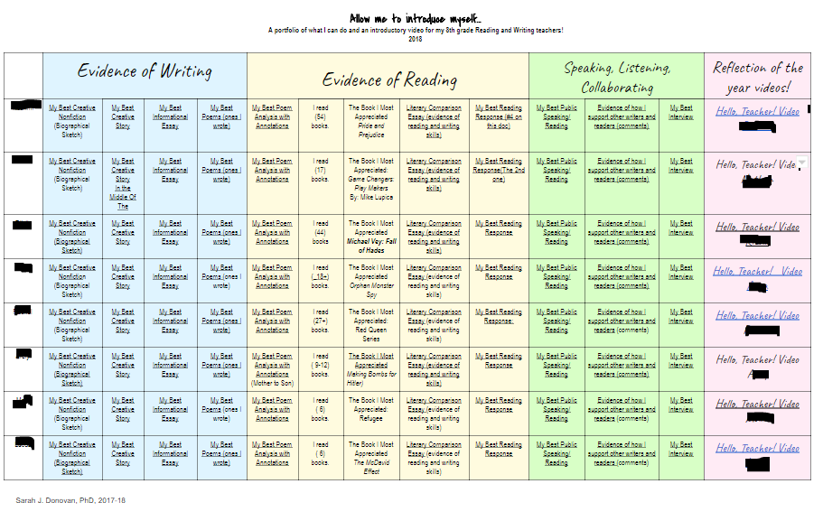 In the past week, seventh-grade students have created a massive hyper doc with links to their best work from the year to reflect on their learning. Then, they recorded a video pointing to and elaborating on the concepts and skills evident in their best work. I framed this project as a way of both reflecting on the year and an opportunity for students to introduce themselves to their future teachers because I will download this hyperdoc as a PDF and share it with our eighth-grade ELA team.