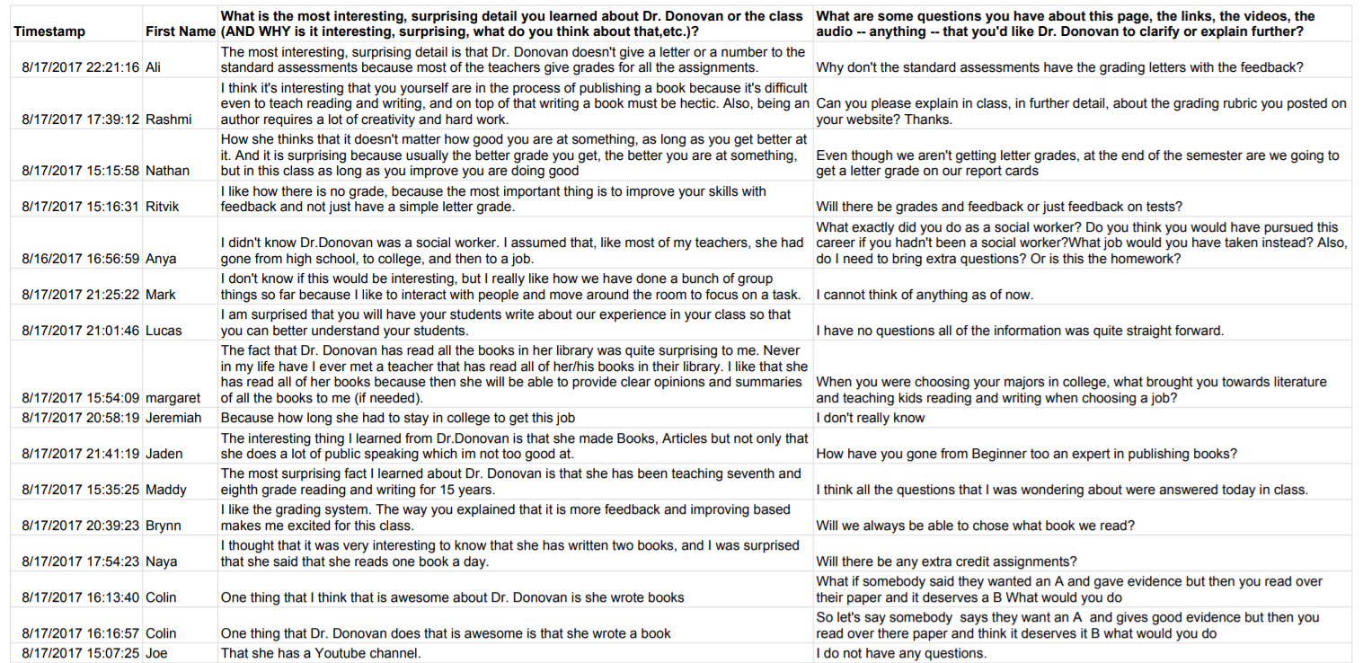 I assigned students the introductory letter I wrote to their parents on “Our Class” page of this website. There is some reading involved, but in this assignment, students also see my Goodreads list, listen to a podcast from Talks with Teachers (an interview with me), and watch my YouTube video about feedback (or why I won’t put a letter or number on any of their papers). I embedded a survey at the bottom of the page for students to tell me 1) what they found interesting and 2) what questions emerged from their experience of the “Our Class” page.