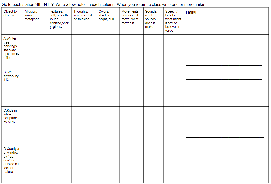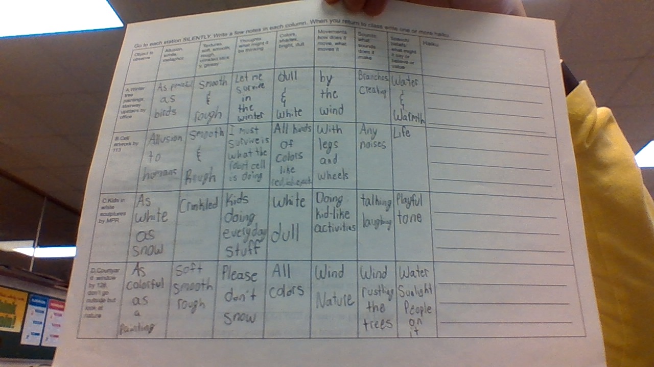 Along the gallery walk, students stopped to observe different pieces (e.g., tree artwork, cell monster posters, a plaster installation, our living courtyard) and take notes using a prewriting sheet. After all the shifts had completed the gallery walk, we began crafting the poems, and then we did a quick peer conference.