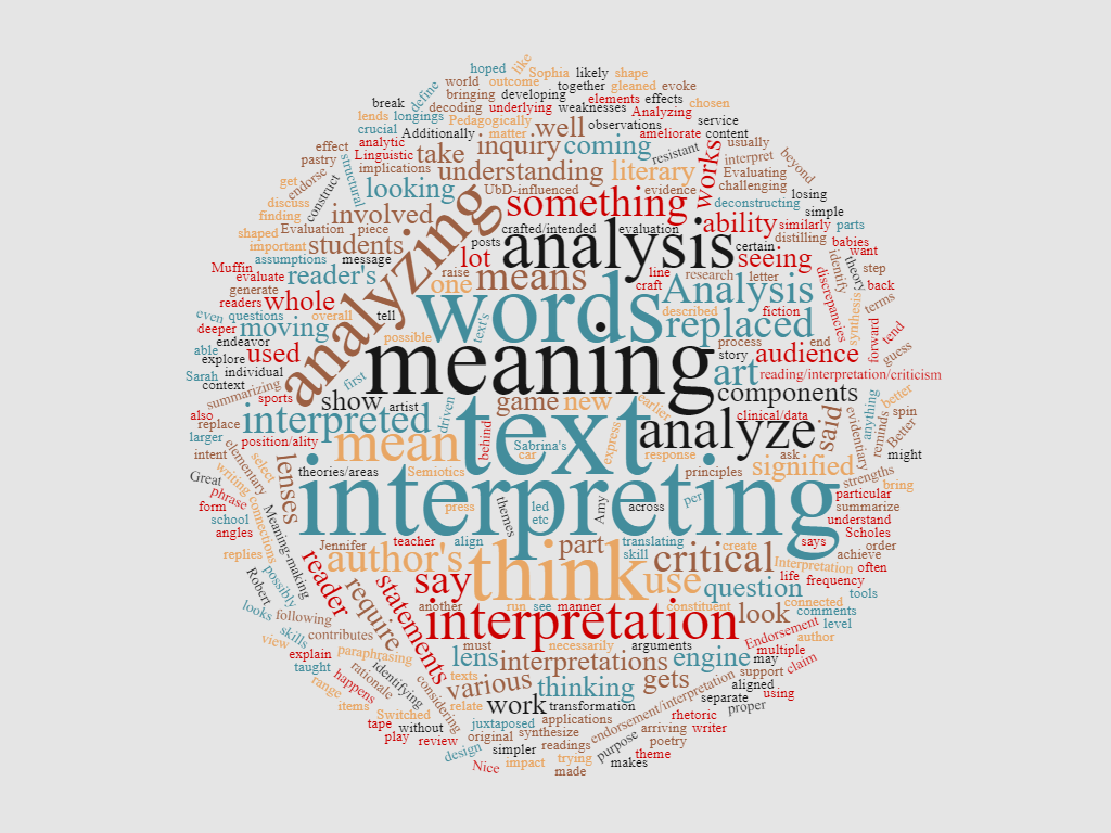 I started to synthesize the data but resorted to the highly reliable and artful word cloud to capture the complexity. The most frequent word is “text” and also “meaning.” Maybe that’s what happens when we talk about teaching in the context of language and not language users. Maybe that’s the problem with mechanisms to assess teaching. The syntax and discourse matter not because our teaching license depends on it but because meaning and understanding depend on it.