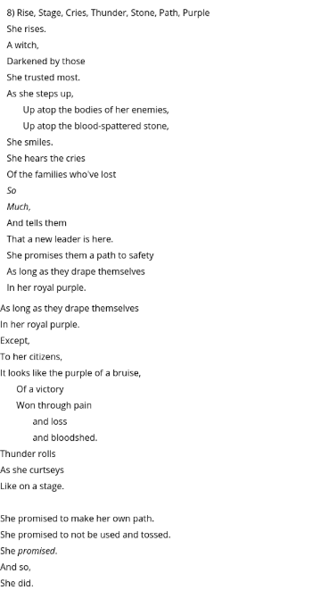 This week, I’m doing something a little bit different. Instead of analyzing a quote from a book, I’m doing one of the poems that we wrote for our 30-day challenge. I am going to be analyzing A–‘s “Connect the Words” Poem. To summarize, this poem is about a queen who has been through many heartbreaks and hardships. She is standing up for her people, who, like her, have also been through many hardships. The poem really emphasizes how, when given power, one can do great things, some bad, others good, and I think this poem is talking about the new leader is a warrior, not just someone who misuses their power. Also, one of the most important things to consider when reading this poem is that she has been betrayed many times, and she has lost a lot of people close to her.