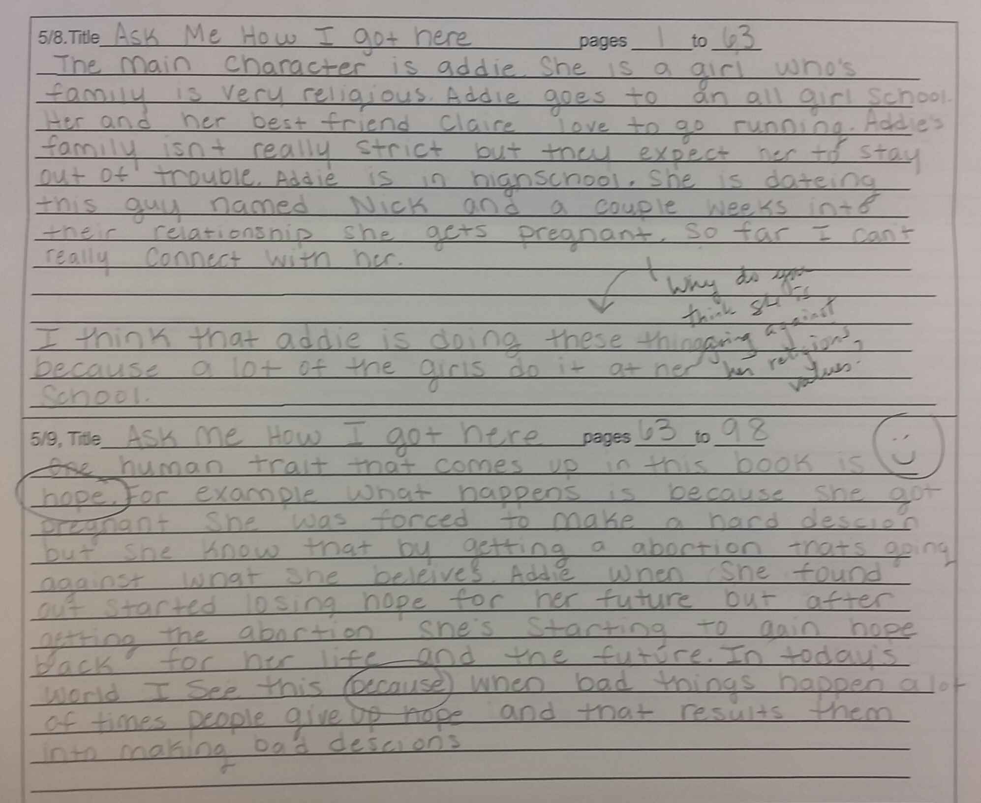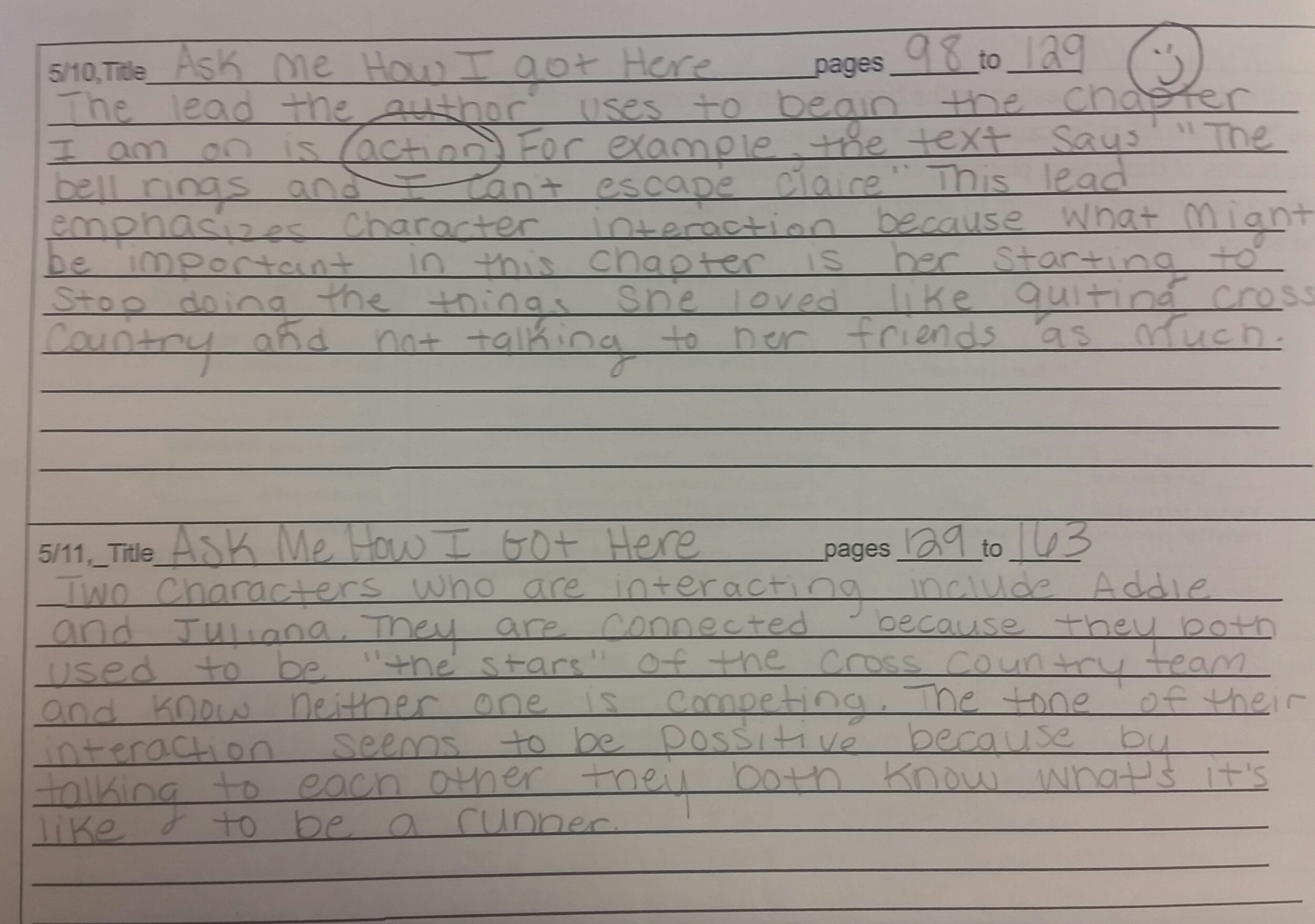 Here are the first four days of responses from a student who is reading Ask Me How I Got Here by Christine Heppermann: