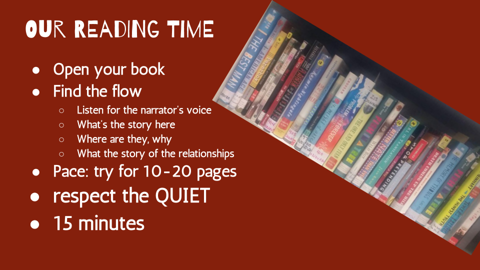 By now you’ve noticed a lot of me trying to control the conditions of the reading experience, and I suspect this has as much to do with trying to hold on to these readers as it is about the books. I love watching them read the books that I read and bought for them. I love watching them calm and in the flow of a story –the smile, the furrowed brow, the tear, the gasp. It’s just so satisfying to see, after just four days, most students are well on their way to getting through the first 100 pages of their books and to hear readers chatting about characters on their own. We’ve come so far, and I don’t want it to end, yet they’re ready.