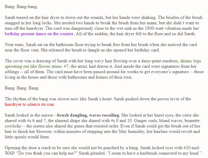 As students submitted their “final” stories (because, let’s face it, there’s always something to add, remove, rework), you asked them to color-code some of the narrative techniques to 1) celebrate their competency but also to 2) check to be sure that what they think is a complex sentence or simile or asyndeton is, in fact, so. You created a great checklist for students to check their content and read for flow. Finally, you scheduled class time for the stories to be published to the class blog for everyone to enjoy.