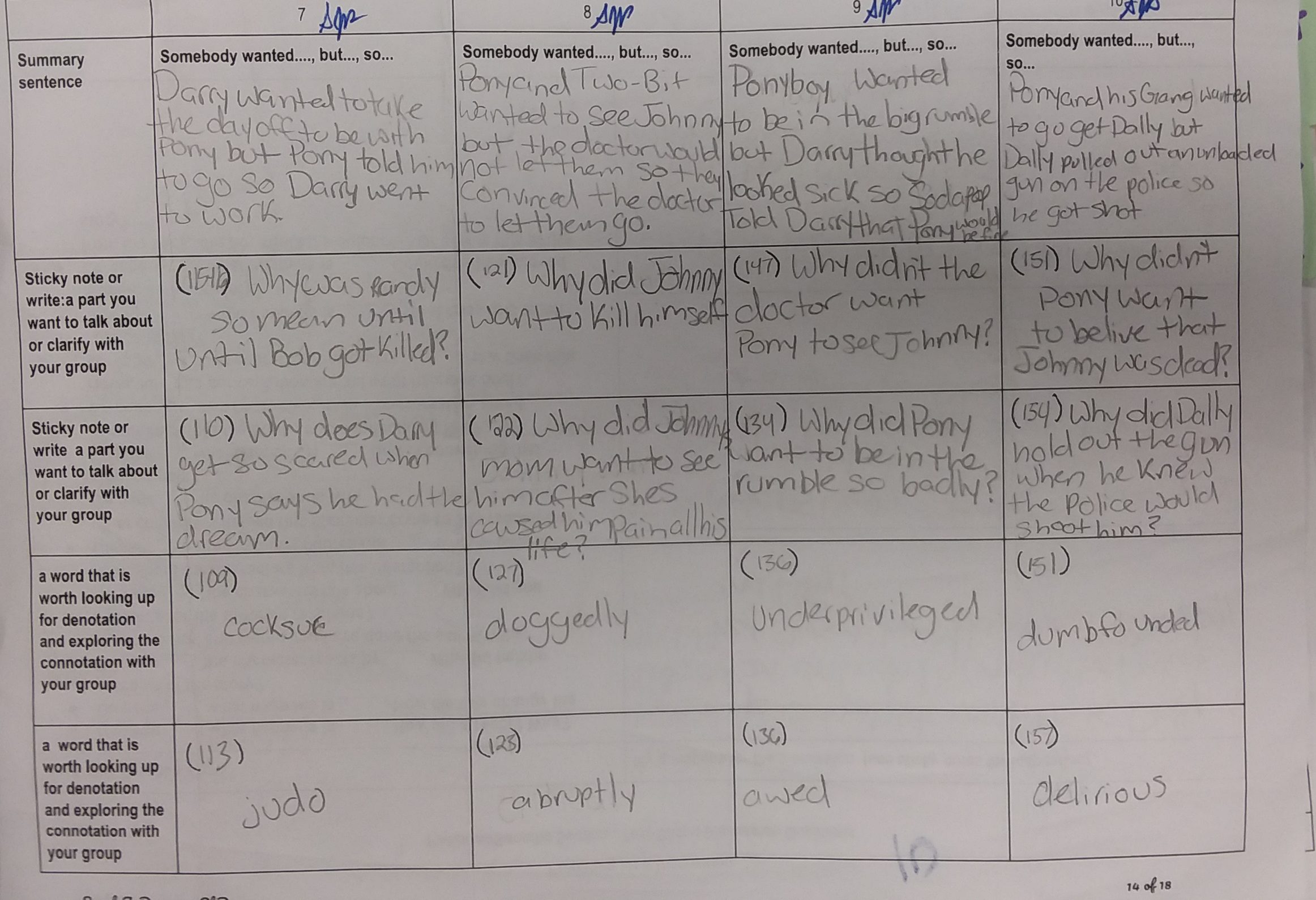 For the first six chapters of The Outsiders, I did what Kelly Gallagher calls a “guided tour,” which means that we read the book one chapter at a time and practiced specific skills: writing a concise summary, analyzing denotation and connotation, tracking the development of classism.